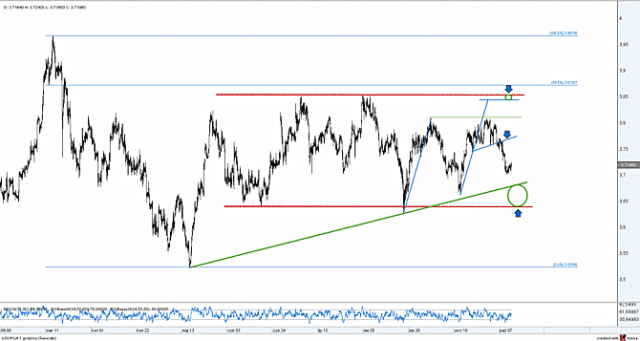 Docelowe zasięgi dla takiego scenariusza rozciągają się pomiędzy 3,6385 a 3,6815. W tej strefie dolne ograniczenie średnioterminowego trendu horyzontalnego zbiega się z istotną linią poprowadzoną po minimach począwszy od połowy maja bieżącego roku. Dopiero na tym pułapie oczekuję uaktywnienia się strony popytowej, a w konsekwencji wykształcenia większego odbicia na tym rynku w szerszym horyzoncie.